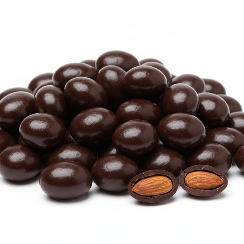 Premium almonds coated in smooth, glossy dark chocolate. These delicious dragees combine the rich taste of dark chocolate with the satisfying crunch of whole almonds.